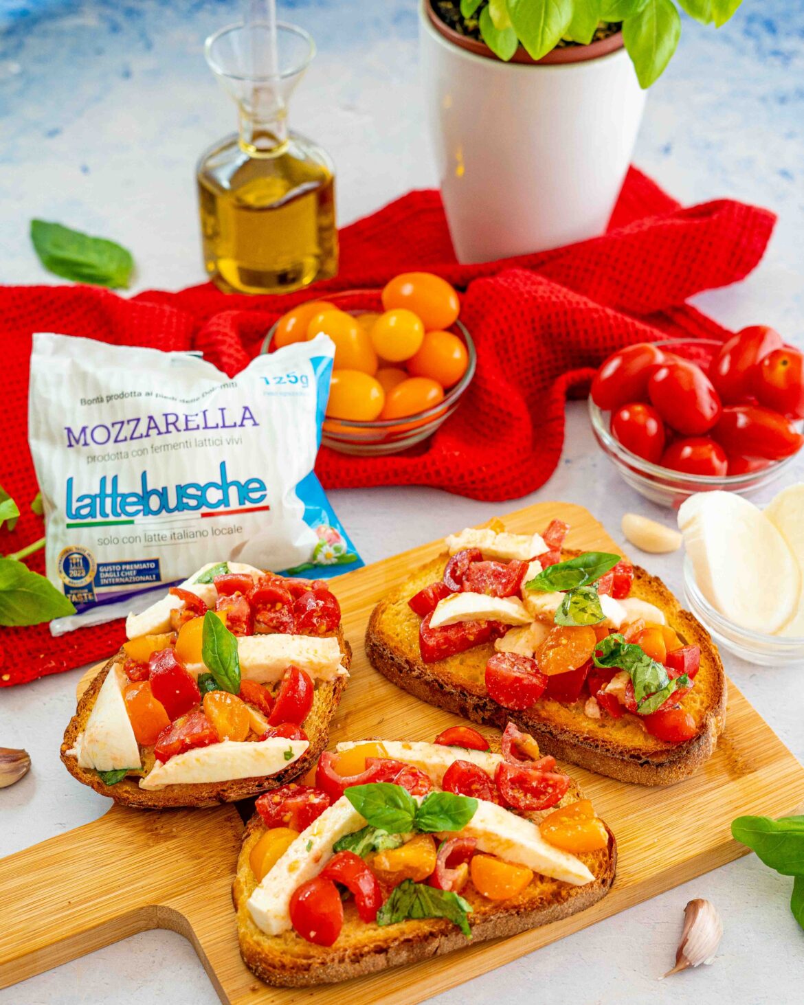 La mozzarella Lattebusche è un formaggio fresco, leggero e dal sapore delicato, fatta solo con latte locale dei nostri soci allevatori: tagliatela a striscioline e ponetela sul letto di pomodorini. La fetta di pane abbrustolito alla base fornirà la nota croccante e i pomodorini datterini quella acidula: questa bruschetta è un ottimo piatto fresco, colorato e squisito!