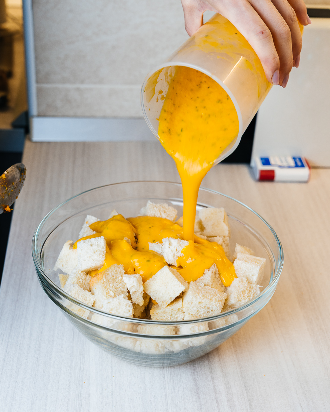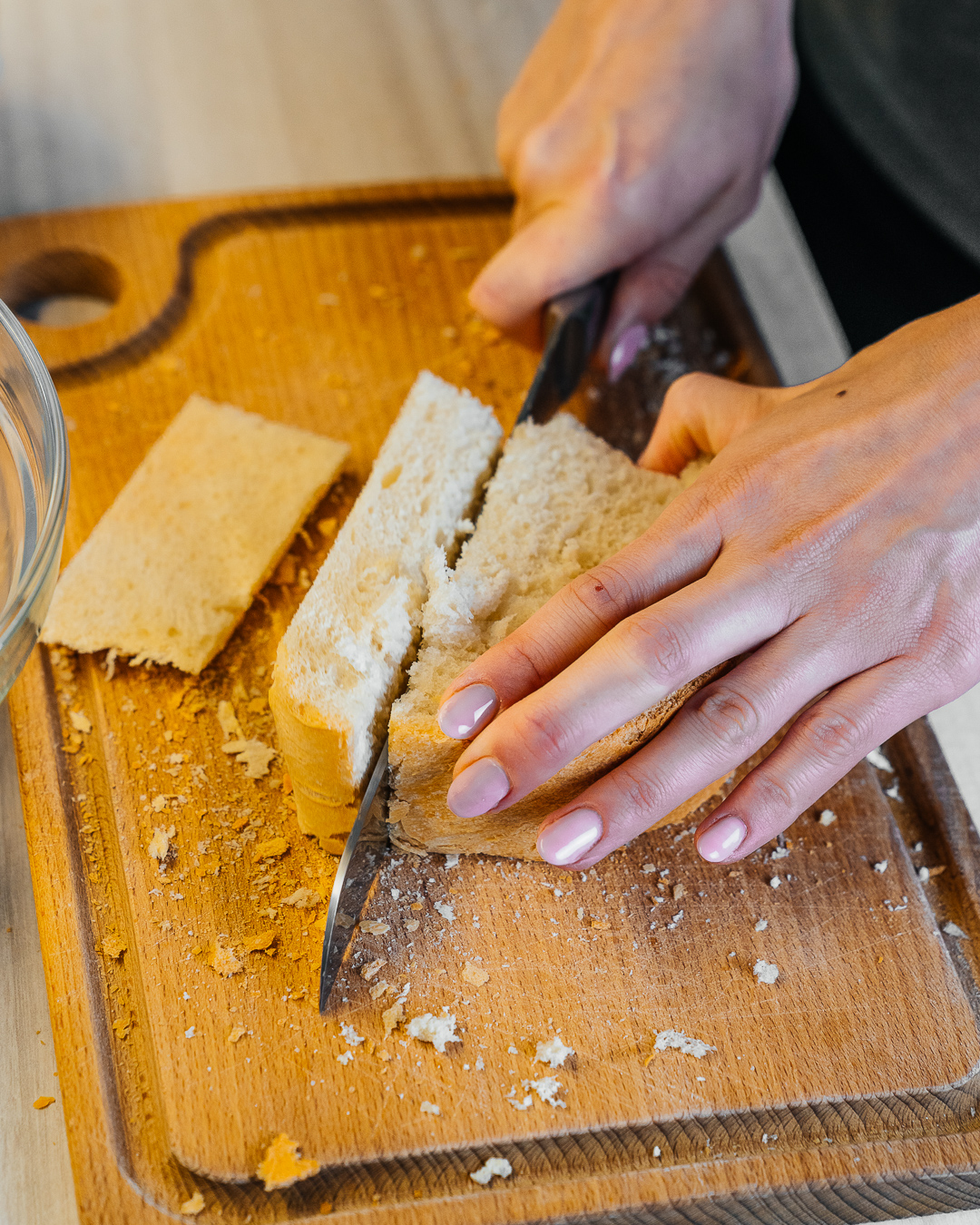 Per prima cosa, tagliate il pane raffermo a cubetti e mettetelo in una ciotola.