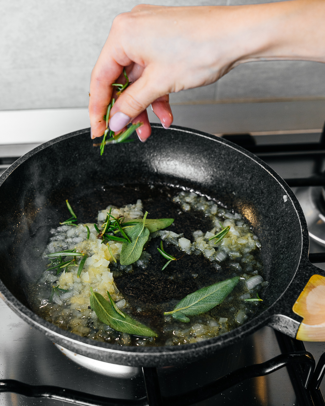 Scaldate l’olio in un pentolino con un filo d’acqua e aggiungete la cipolla tritata, insieme alla salvia e al rosmarino. Fate rosolare per qualche minuto e poi toglietele dal fuoco.