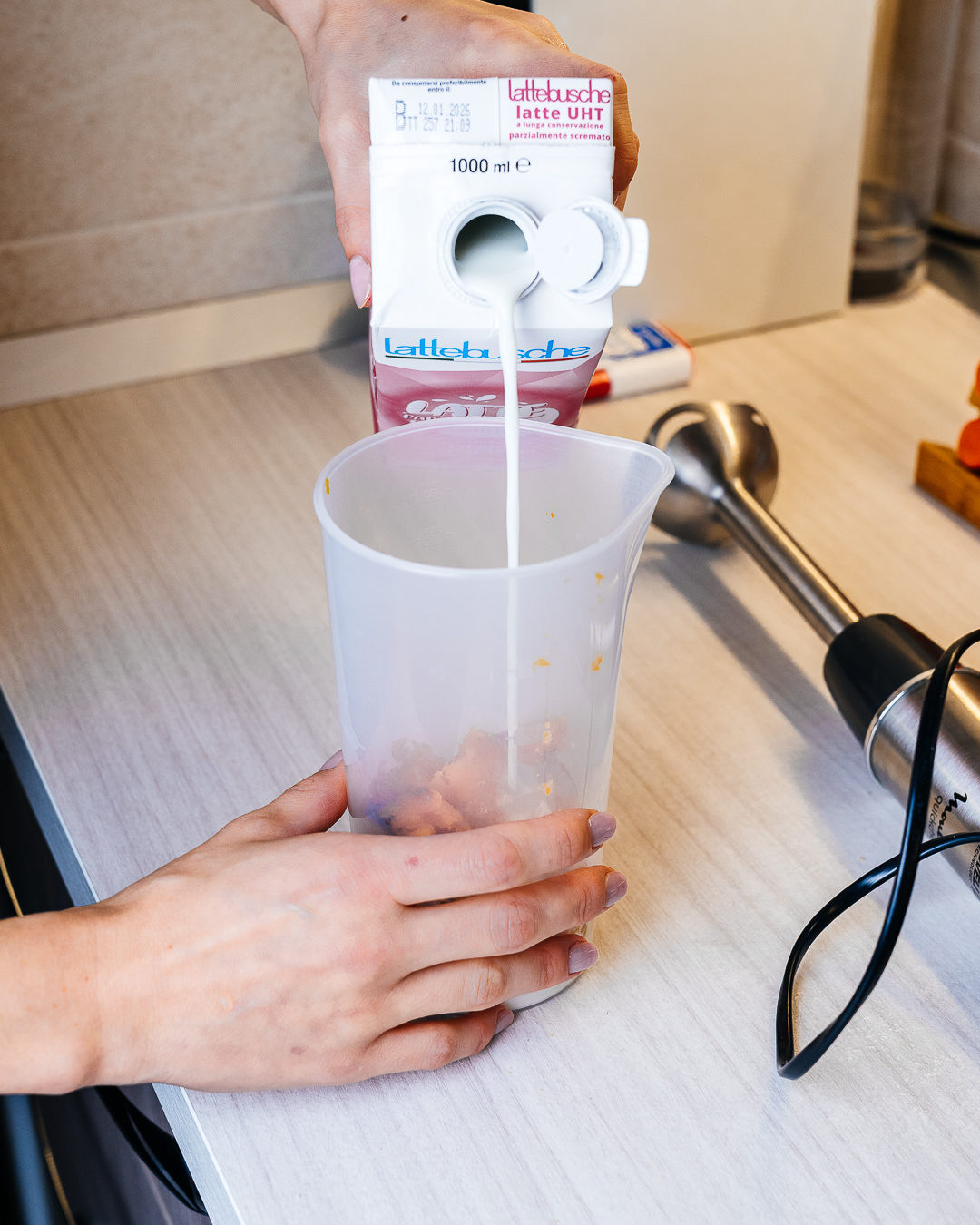 A questo punto frullate la zucca cotta, la cipolla rosolata con salvia e rosmarino, il latte e le uova. Aggiustate di sale e noce moscata. Frullate finchè non otterrete una purea.