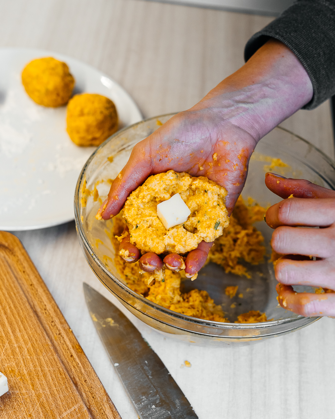 Formate i vostri canederli: con le mani bagnate, prelevate un po’ di impasto e mettete al centro un cubetto di formaggio. Richiudete e poggiateli su un vassoio infarinato.