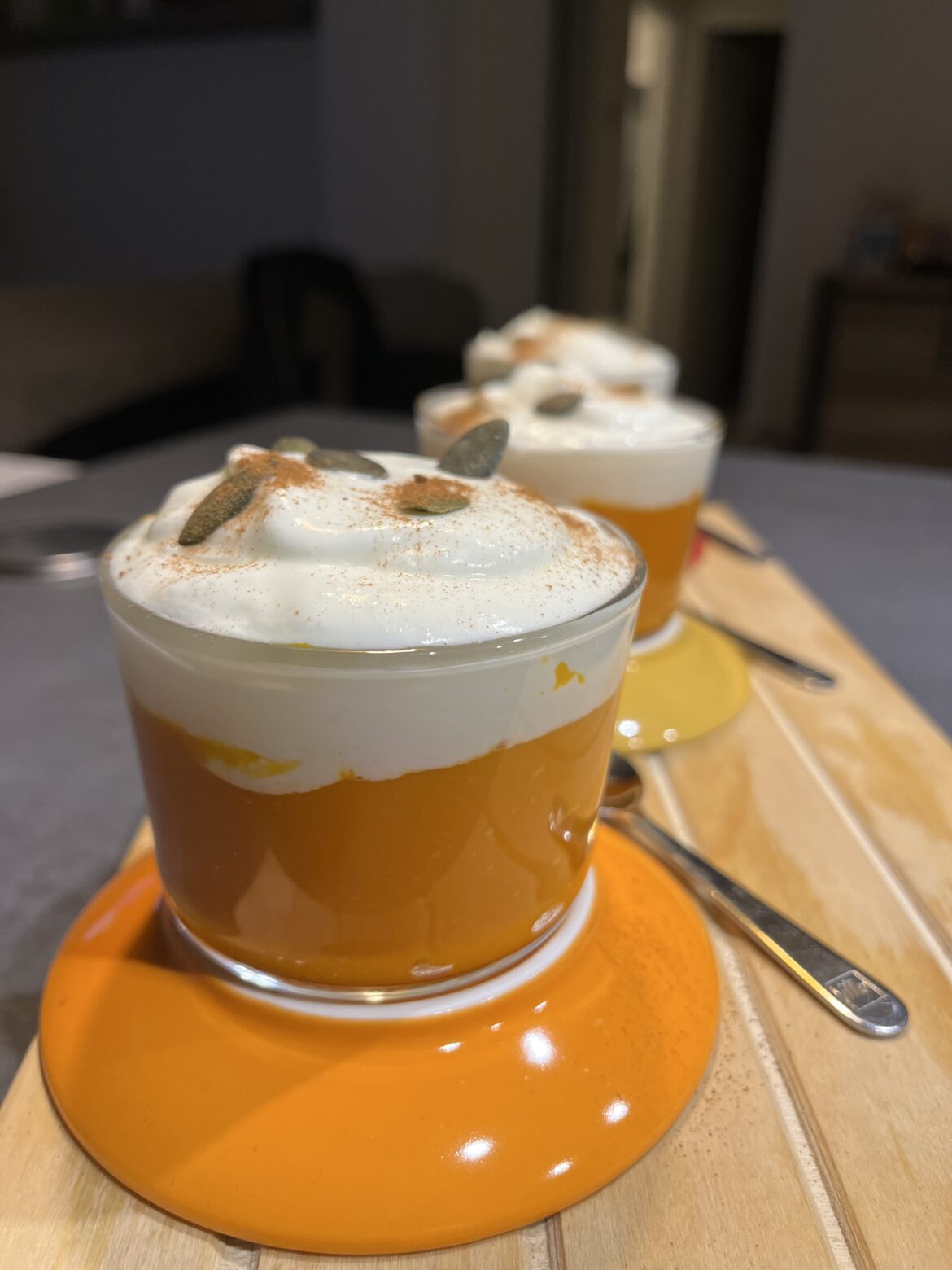 Prendi una tazza da cappuccino trasparente e versa all’interno la crema di zucca preparata precedentemente. Con la crema al formaggio fai il topping creando uno strato bianco a contrasto. Finisci il tutto con dei semi di zucca tostati che aggiungeranno una nota croccante.