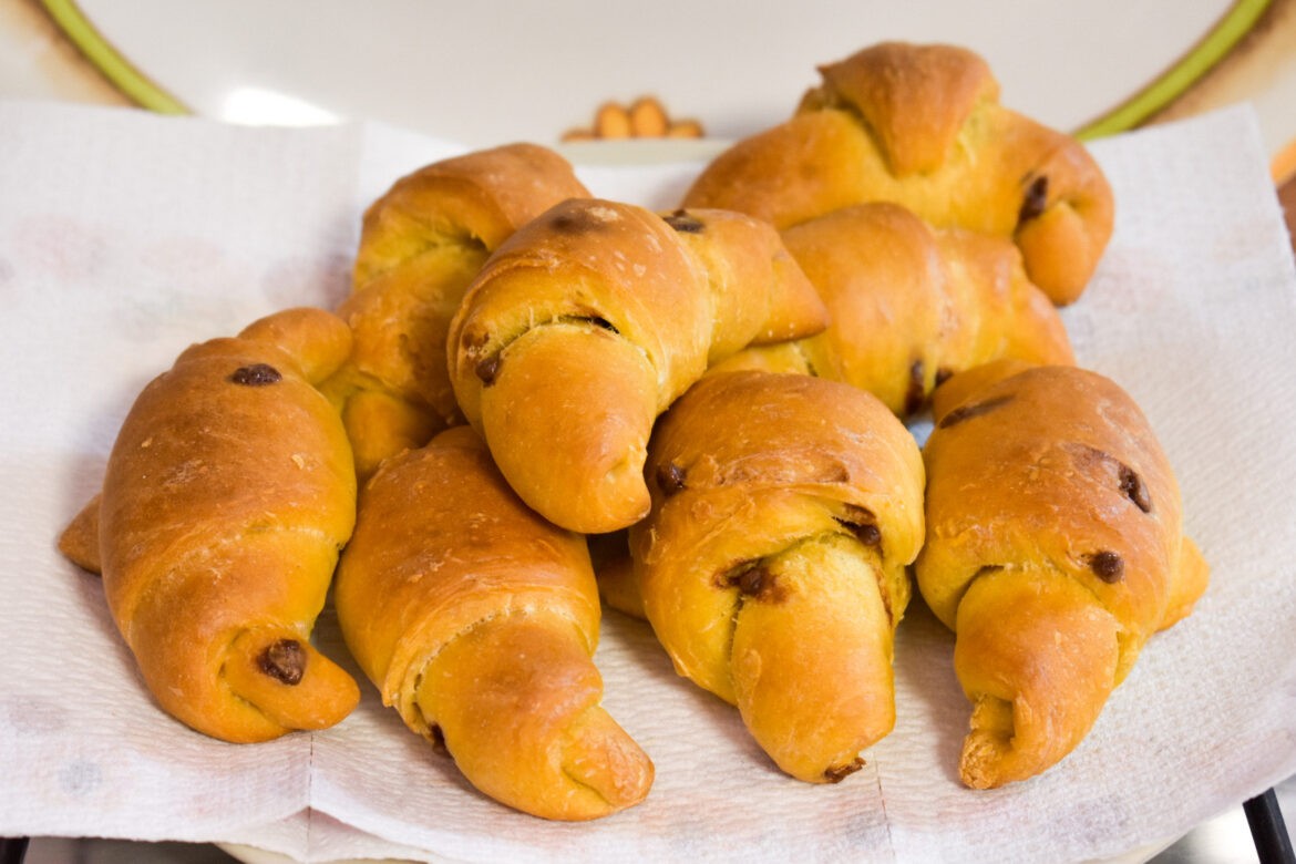 Arrotolare gli spicchi su se stessi. Disporre di una teglia rivestita da carta forno e lasciare riposare 15 minuti.
