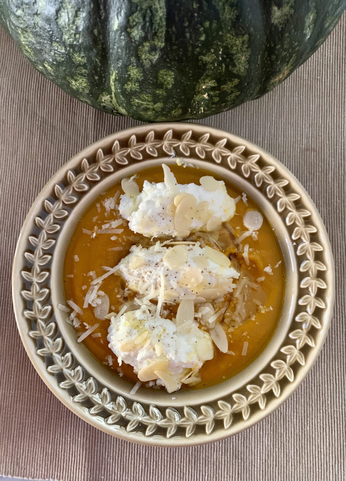 Impiattate la crema di zucca con delle quenelle di ricotta magra Lattebusche, mandorle a lamelle, parmigiano e una spolverata di pepe.