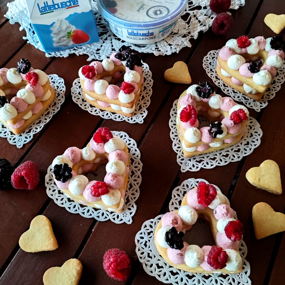 Riempire due sacche da pasticcere con le due creme diverse e farcire i cuoricini, decorare con frutti di bosco freschi.