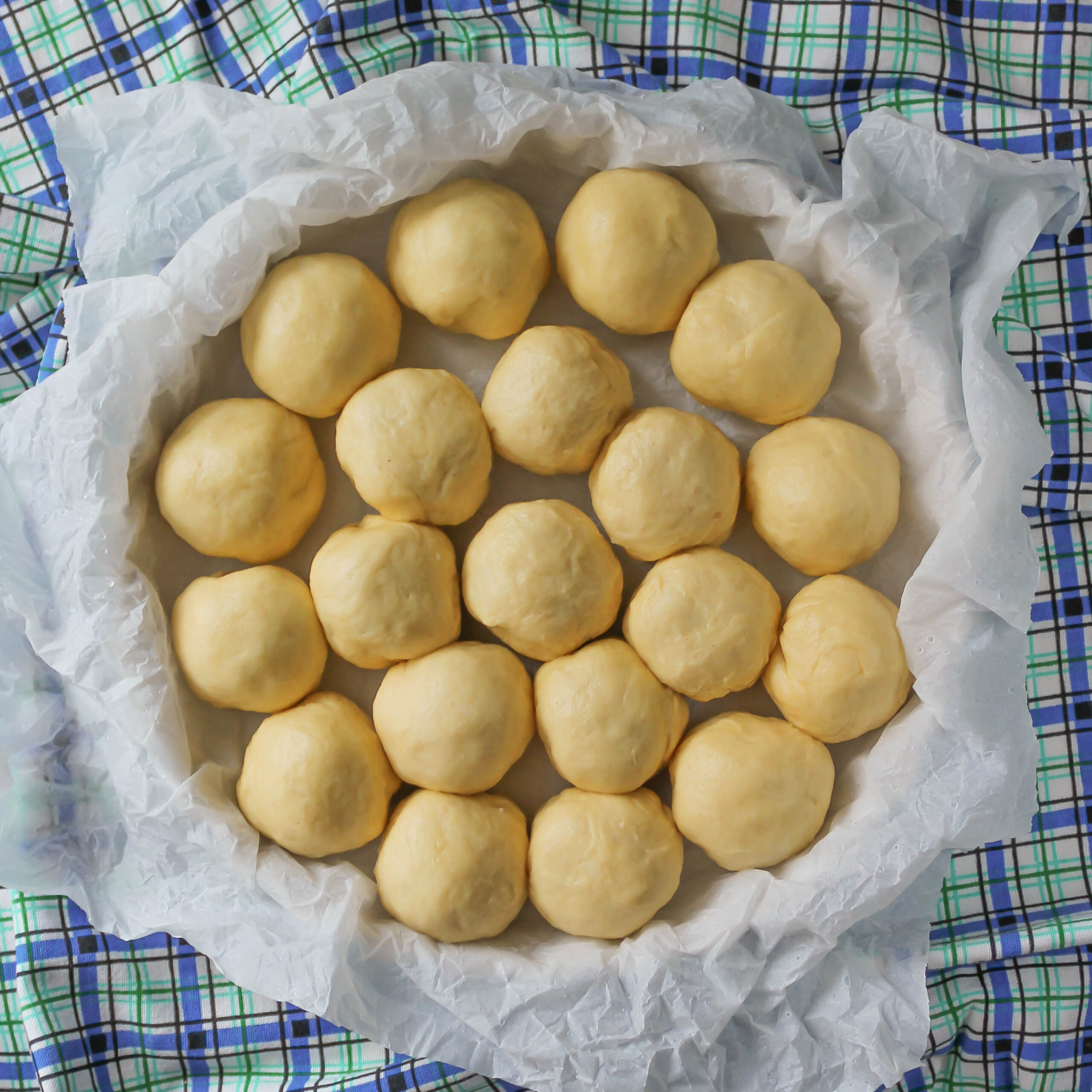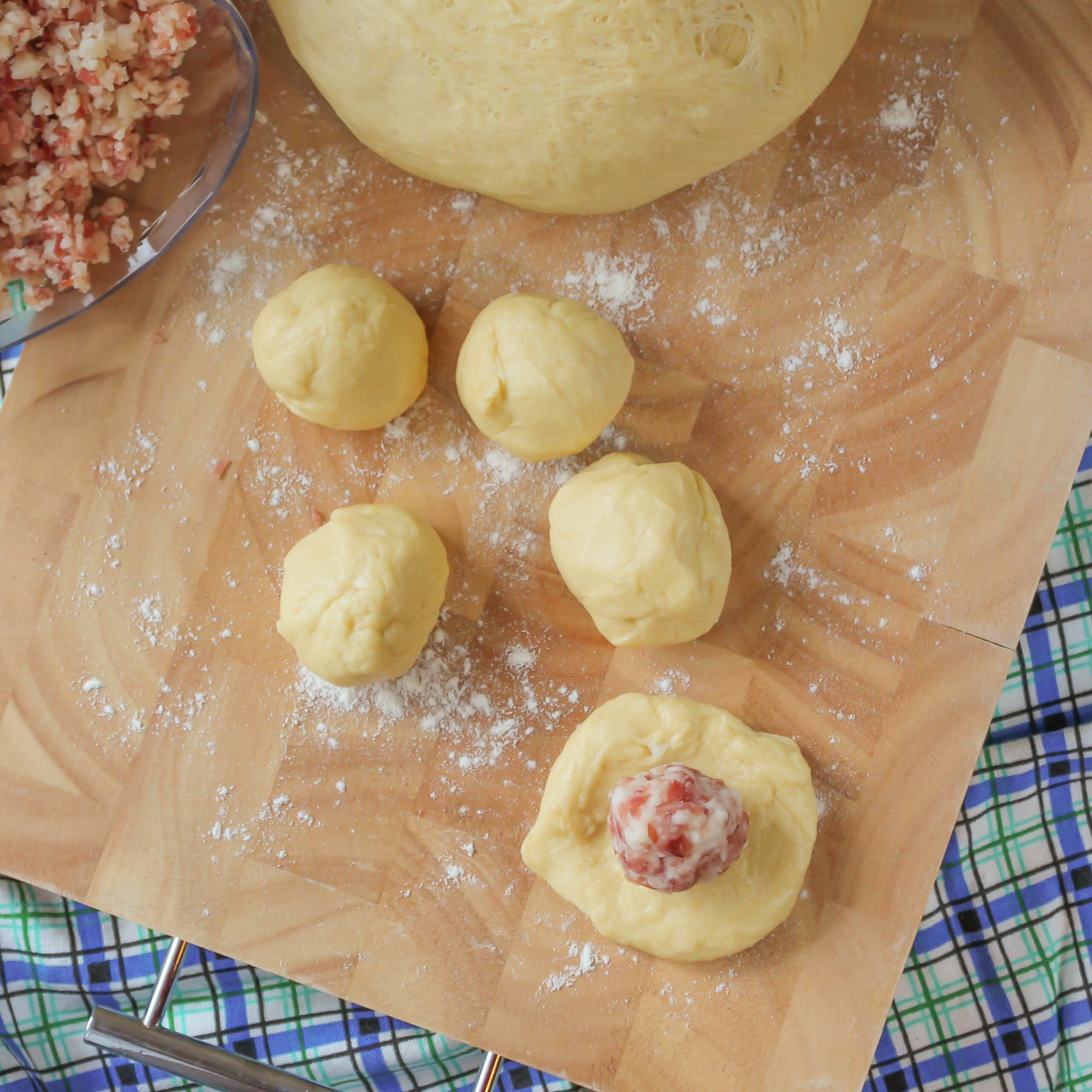 Riprendi l’impasto lievitato e dividilo in circa 30 bocconcini. Allarga ciascun bocconcino a mano o con il mattarello, sistema una pallina di ripieno nel centro e richiudi bene l’impasto, prima sigillando le estremità e poi appallottolandolo. Formerai così tante palline farcite.