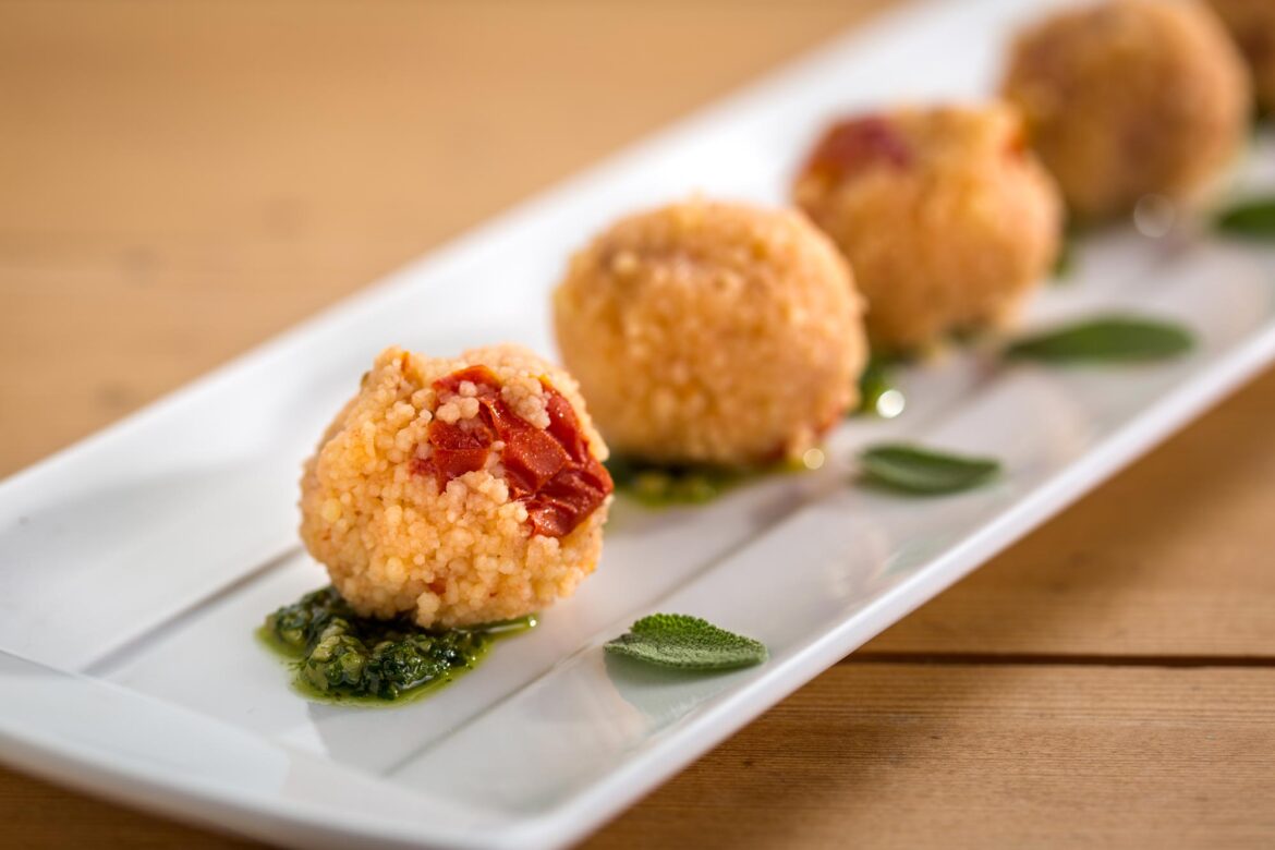 Quando il couscous è pronto e tiepido, lavoratelo con il mascarpone, le alici tritate e i pomodori tagliati a pezzettini. Formate dei piccoli gnocchetti rotondi.