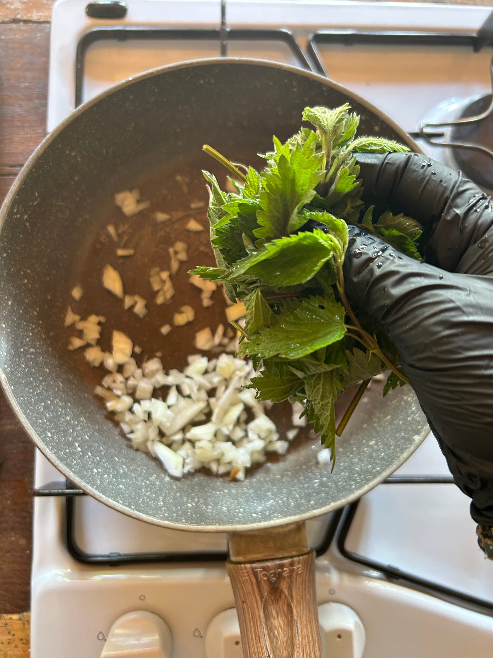 In una padella antiaderente rosolare la cipolla con un filo d’olio e aggiungere le ortiche. Salare e proseguire la cottura per qualche minuto