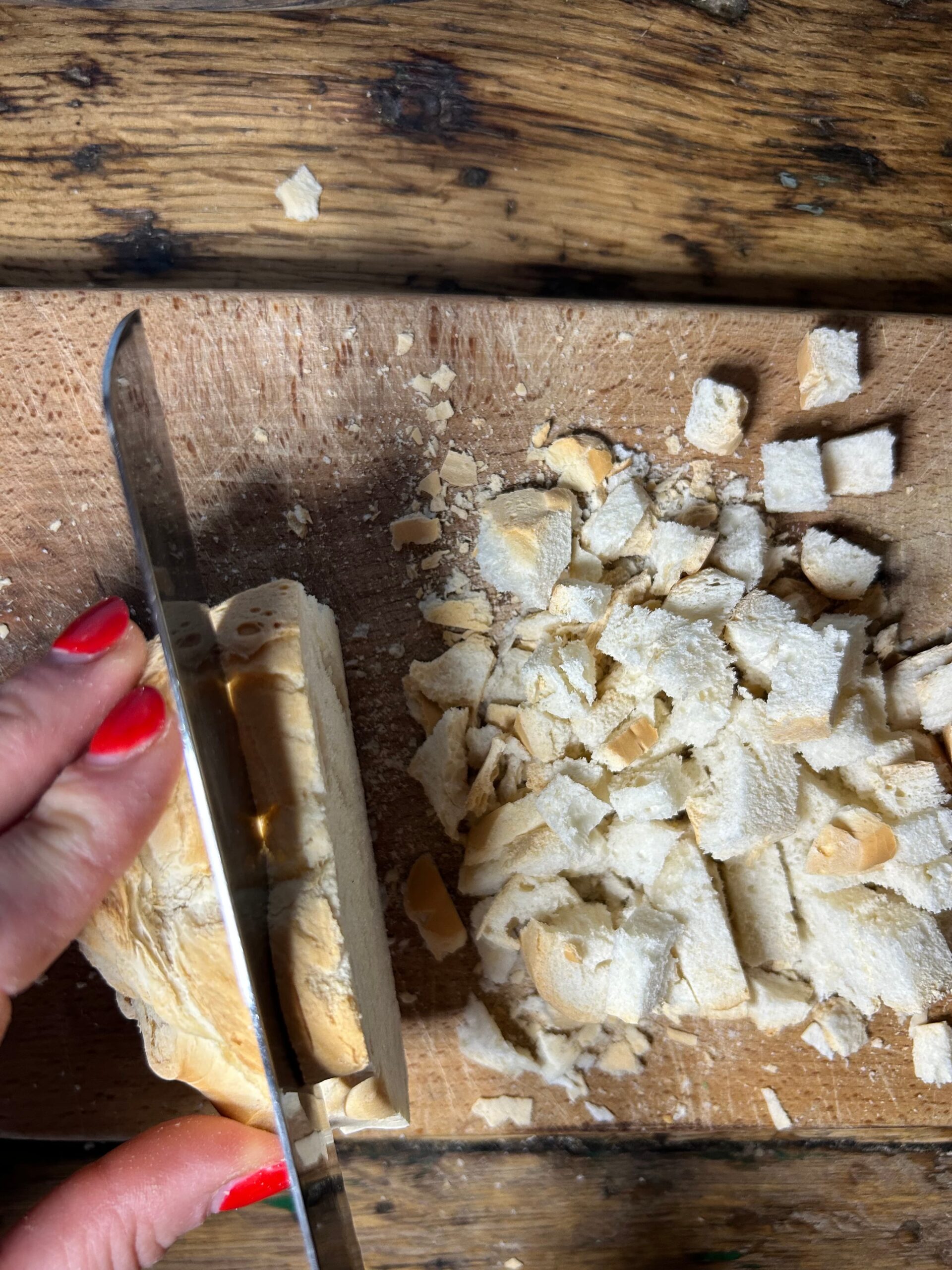 Tagliare il pane a cubetti e metterlo in una ciotola, versare sopra il latte e far riposare per circa 10 minuti.