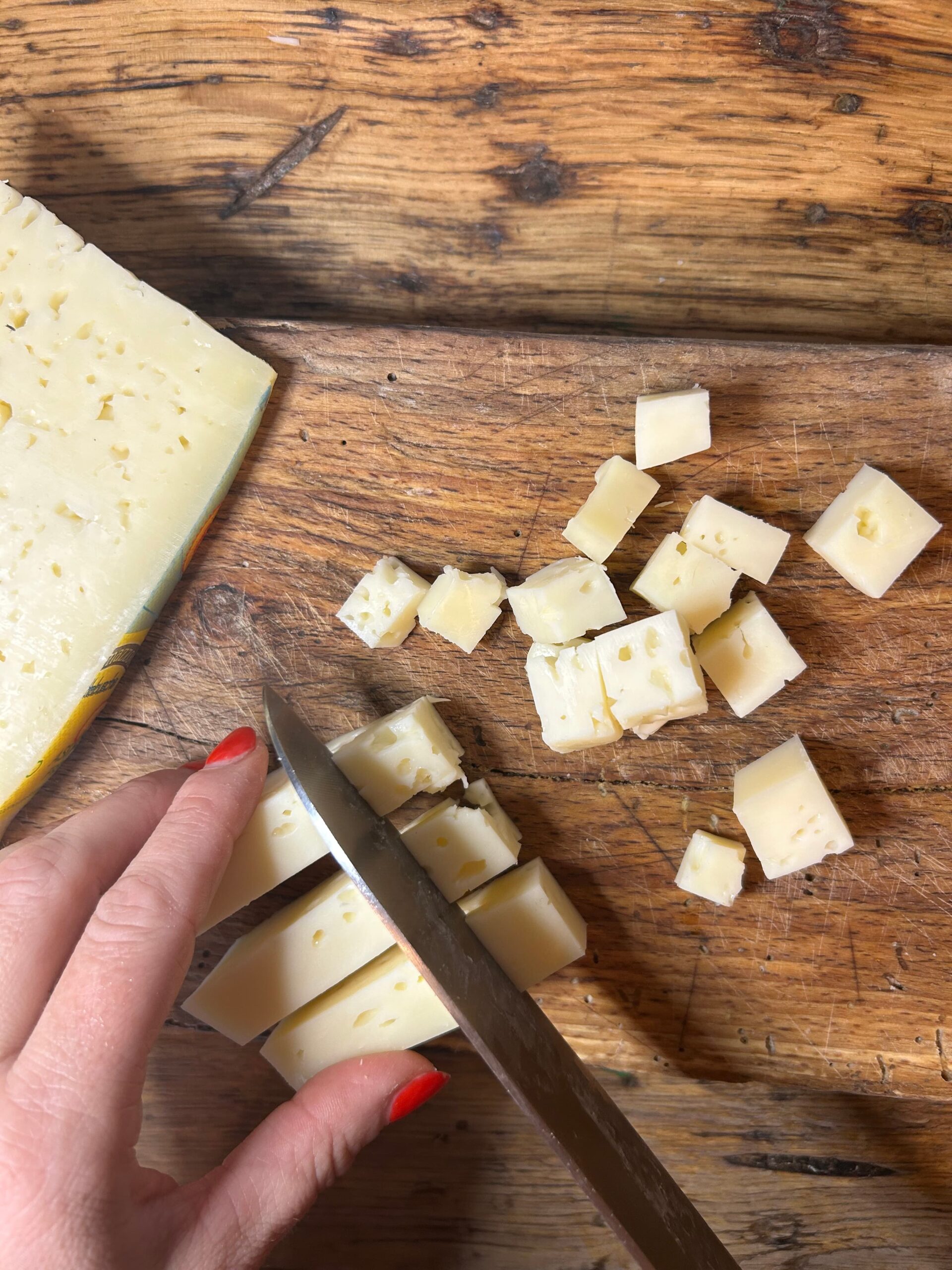 Tagliare a cubetti il formaggio Asiago DOP fresco.