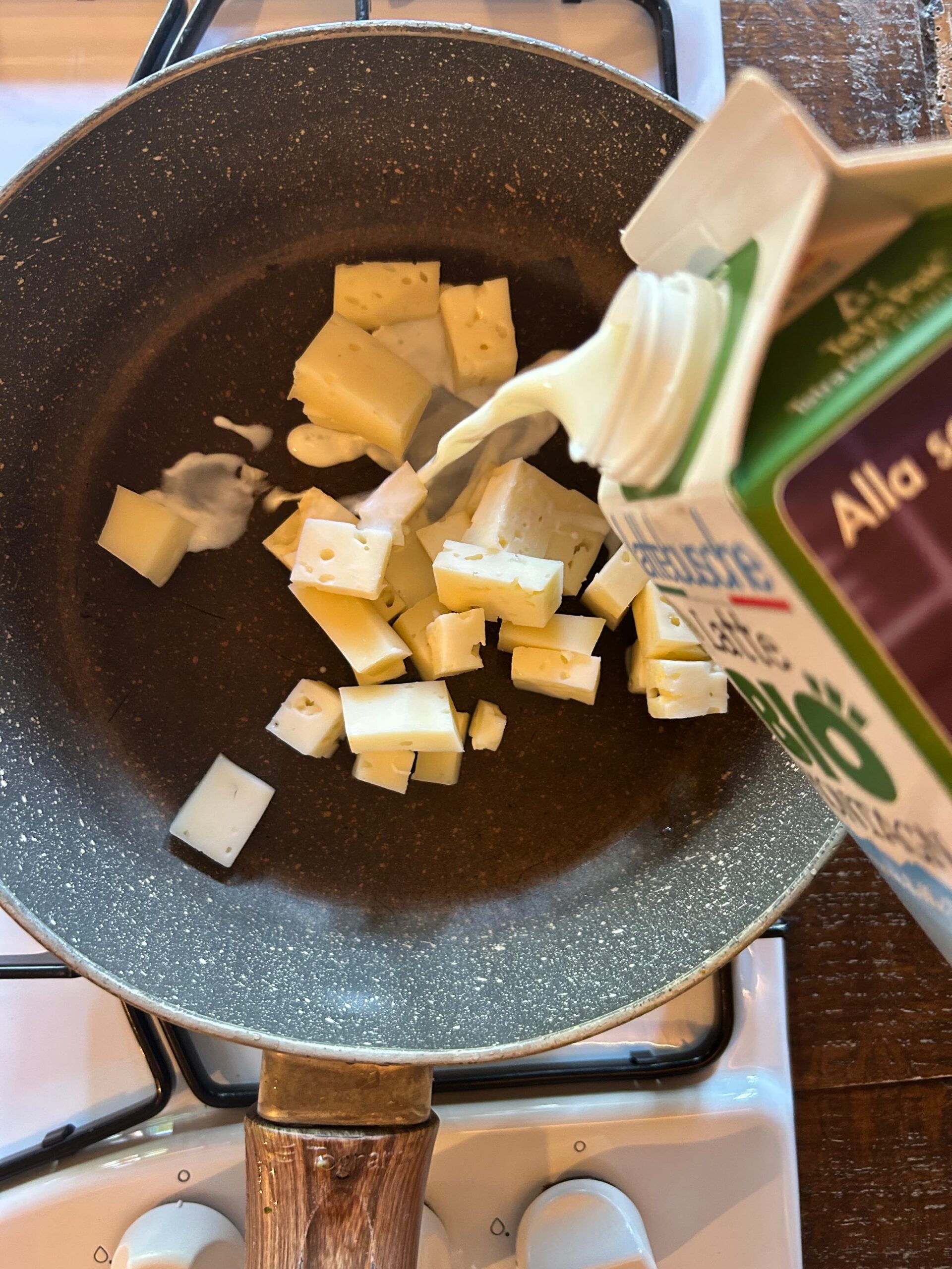 In una padella sciogliere il formaggio Asiago DOP fresco assieme ad un goccio di latte Bio di montagna.