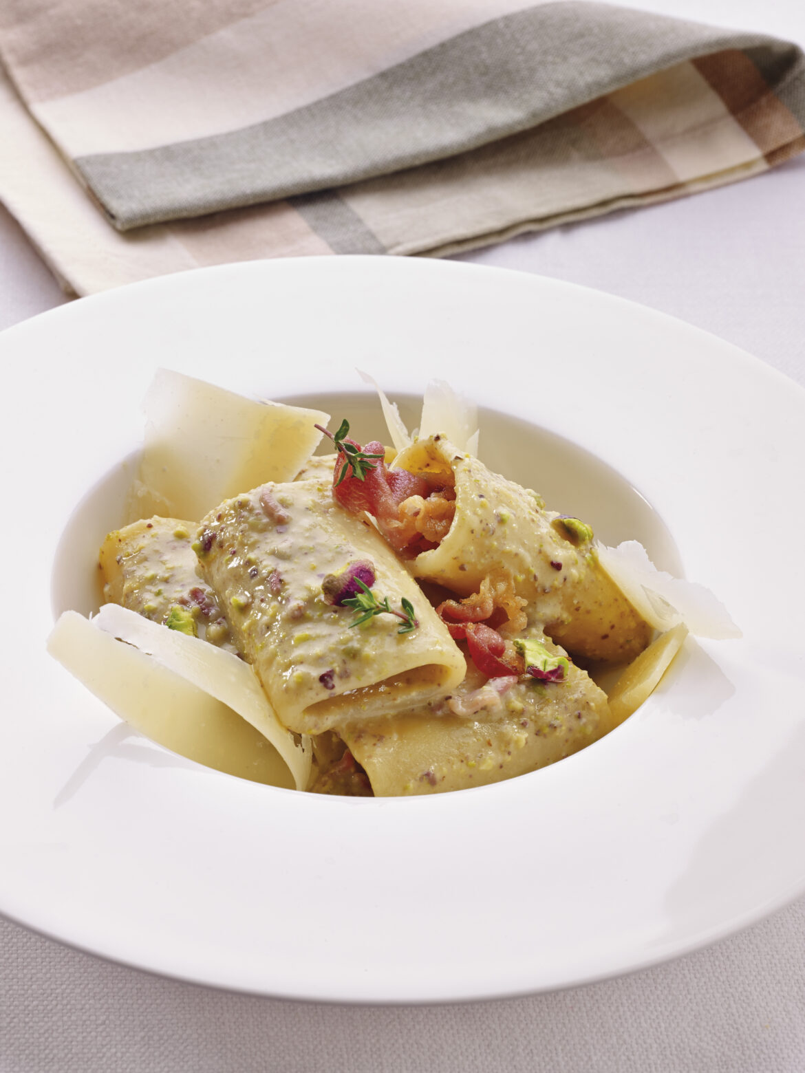 Paccheri speck, pistacchi e Piave DOP Vecchio