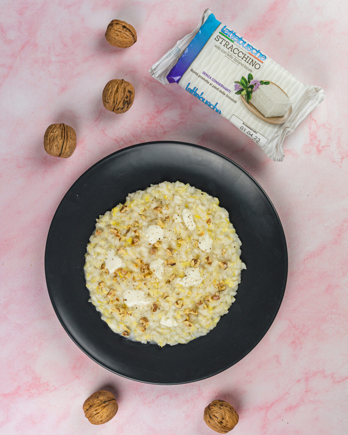 Completate il vostro risotto con qualche “goccia” di stracchino a crudo, le noci e un po’ di pepe.